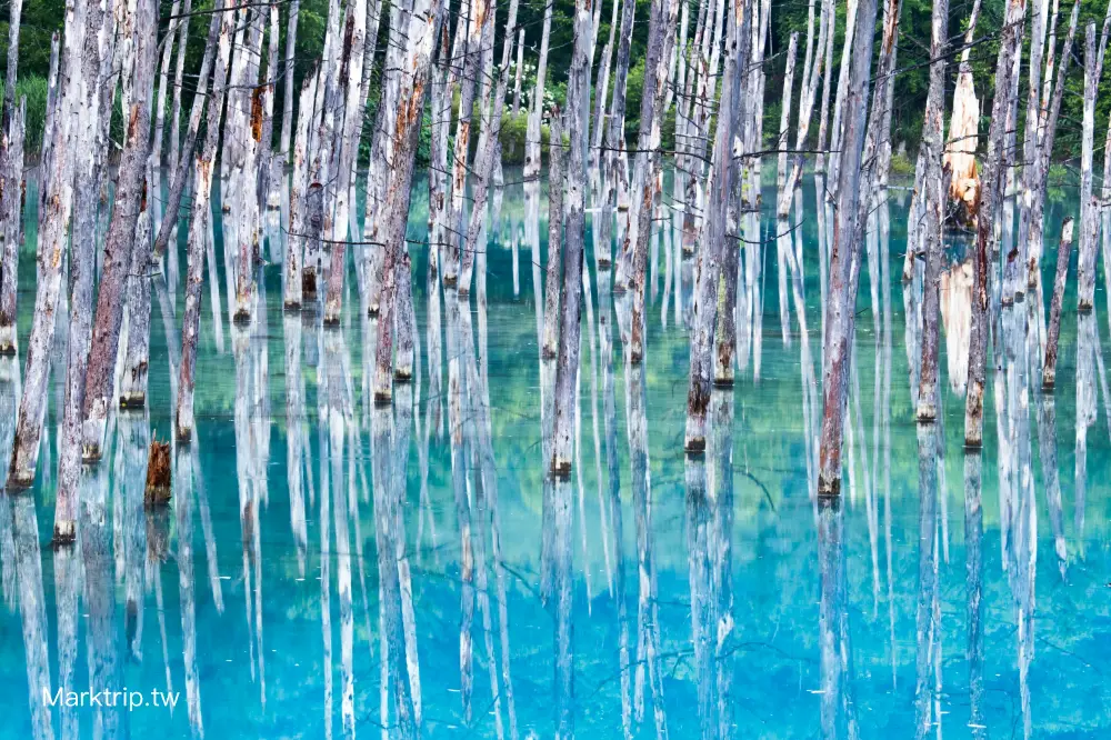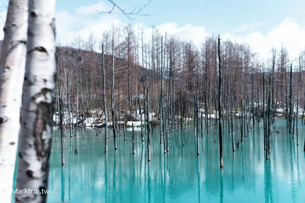 這抹藍之所以迷人,並非偶然。據說是由於美瑛川與硫磺澤川交會後,水中富含鋁、硫磺與石灰等天然礦物質,這些成分沉積在河床,形成白色底層,在日照與氣候條件良好時反射出奇特的藍綠光澤。水中的幾株落羽松與白樺枯木,因長年泡水而無葉僵立,更為整個池景增添幾分神秘與靜謐氛圍。