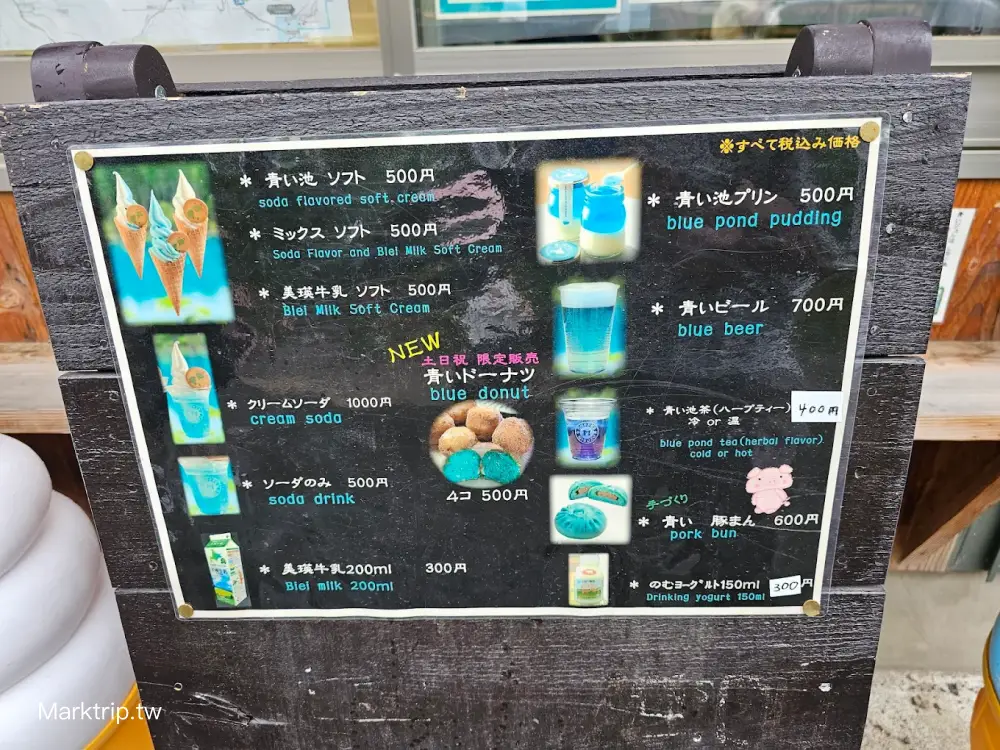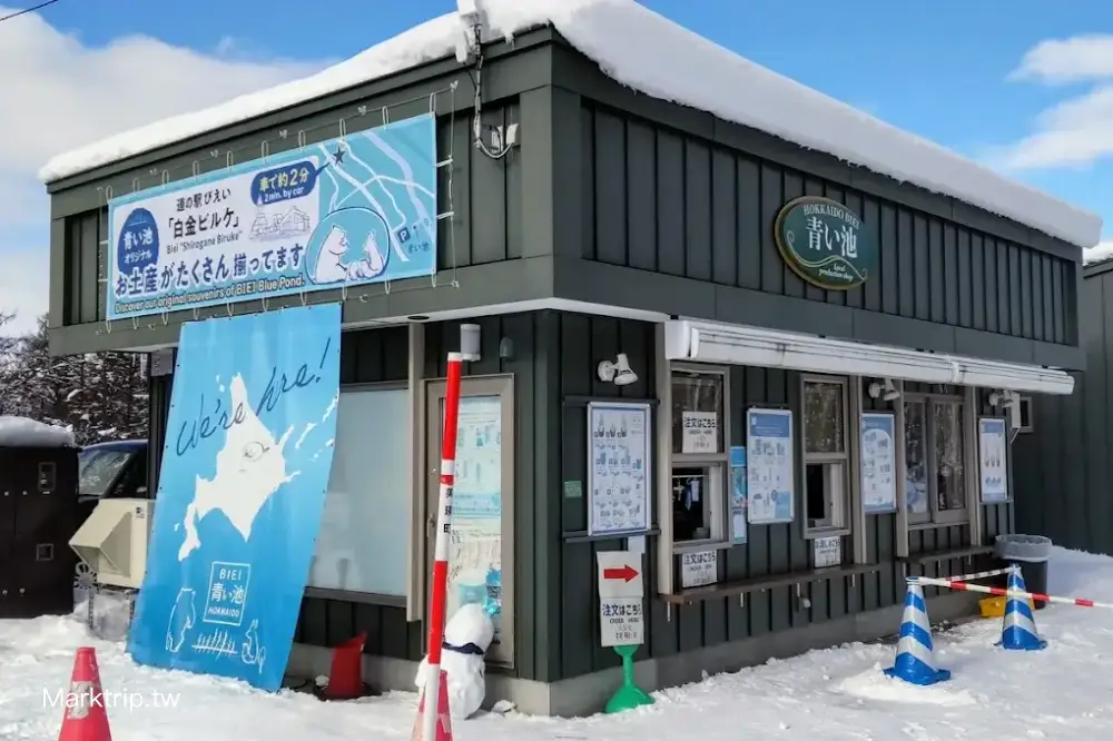 設有簡易販售部與廁所,可以買到飲品、北海道限定甜點與特色土產。值得一提的是這裡賣的青池周邊商品相當有創意,不只有印有池面倒影的明信片與筆記本,還有以青池藍為主題設計的霜淇淋與飲料,直接成為網路打卡的熱門美食。尤其推薦「青池藍」牛奶糖與限定包裝的北海道薰衣草香氛產品,作為伴手禮非常有特色又不失品味。