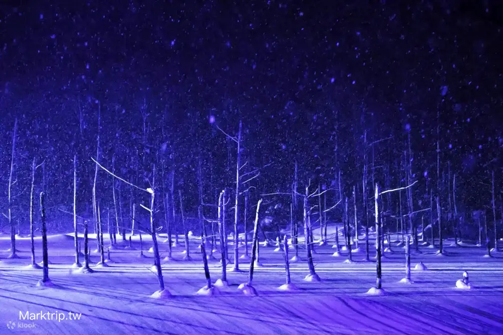 多數人對白金青池的印象停留在夏季蔚藍與綠意交融的畫面,其實冬天的青池別有一番風情。每年12月至隔年2月,美瑛町會舉辦限定的「青池夜間點燈活動」,在寒夜中為結冰池面打上冷色調燈光,營造出如極光般的夢幻景致。潔白的雪地襯托著藍白交錯的光線,讓原本寂靜的池面成為攝影師與戀人們私藏的冬季絕景。