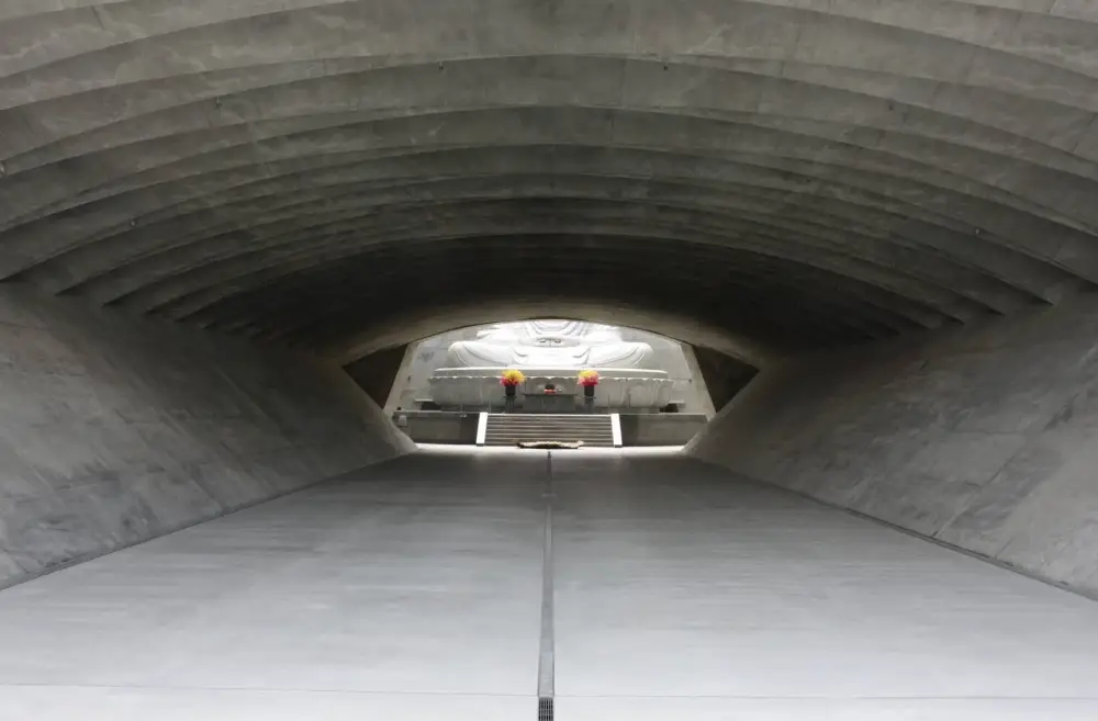 安藤忠雄的建築哲學一向強調「光與影」「混凝土與自然」的對話,而在頭大佛這個作品中,他更進一步加入「時間與情感」的層次。整條參拜動線如一段沉思旅程,從黑暗走向開闊,從看不見佛的輪廓,到走進其中、仰望其全貌,宛如心靈被逐步開啟。