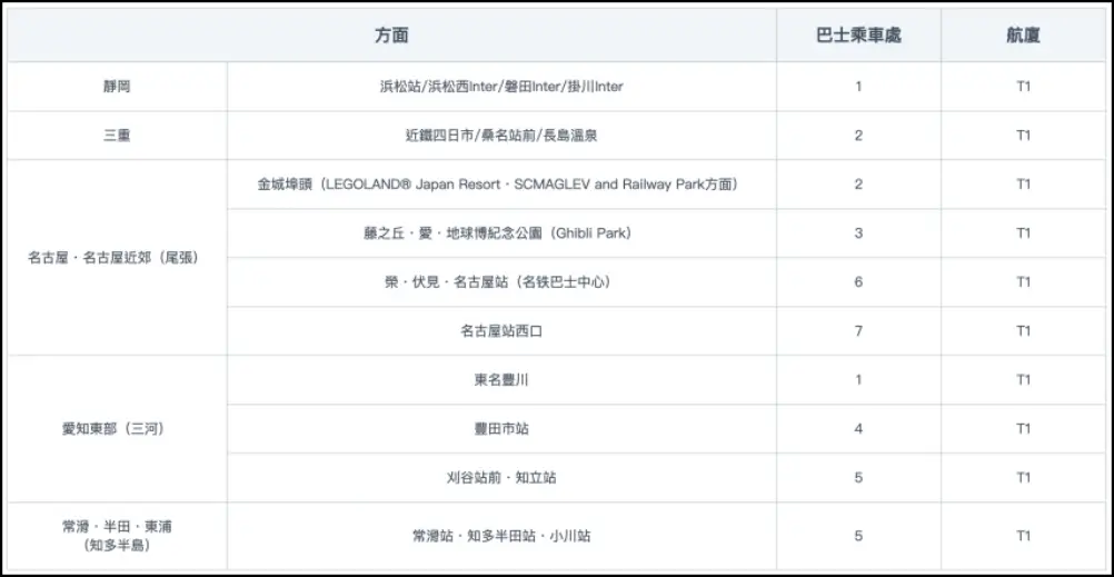 若從機場直接前往岐阜、三重、靜岡、長野等中部城市,也有高速巴士可直達,不需繞回名古屋市區,是節省時間的聰明選擇,大家可以直接在官網點選路線&時刻表。(停靠站可能會有所調整,請以官網標示為主)
