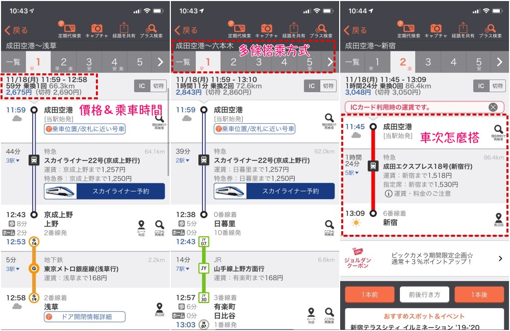 最後再推薦大家這個在日本旅遊手機必備乘換案內(Japan Transit Planner),只要簡單輸入出發地&目的地就可以馬上查到乘車的方法,而且準確度非常高,會把車票價格、乘車時間、車次怎麼搭、是否需要中途換車⋯就連幾號月台都列的清清楚楚,其實日本人自己也都會使用。