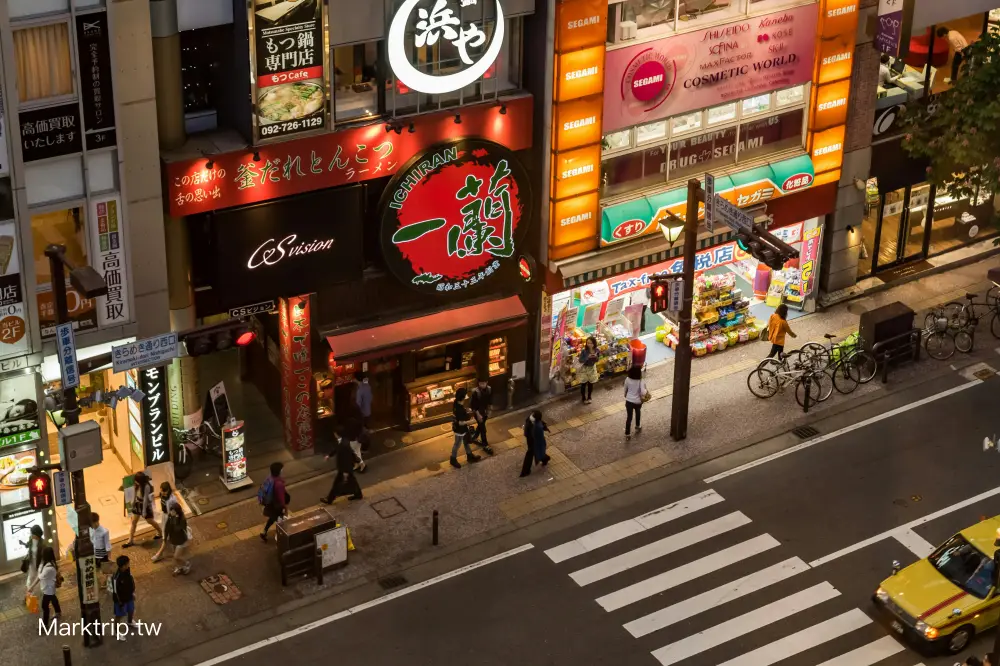 下樓即鬧區購物超方便,走幾步就能吃到「限定版方碗一蘭拉麵(釜醬汁豚骨)」,不用像總本店那樣排隊排到天荒地老,而且吃完還能去周邊的藥妝店捕獲,房間隔音比想像中好,聽不太到街上喧囂。浴室水壓強勁洗澡很爽,但標準房型若攤開兩個大行李箱,走道空間會變得很侷促。