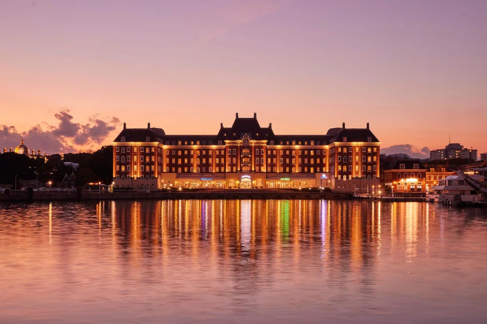 豪斯登堡 海牙酒店 (Hotel Denhaag Huis Ten Bosch) 前身是沃特馬克酒店(Watermark),位於園區的最深處,緊鄰大村灣。這裡遠離了熱鬧的遊樂區,擁有一種遺世獨立的寧靜感。飯店風格精緻優雅,海景房可以看到絕美的海灣日落與晨曦。