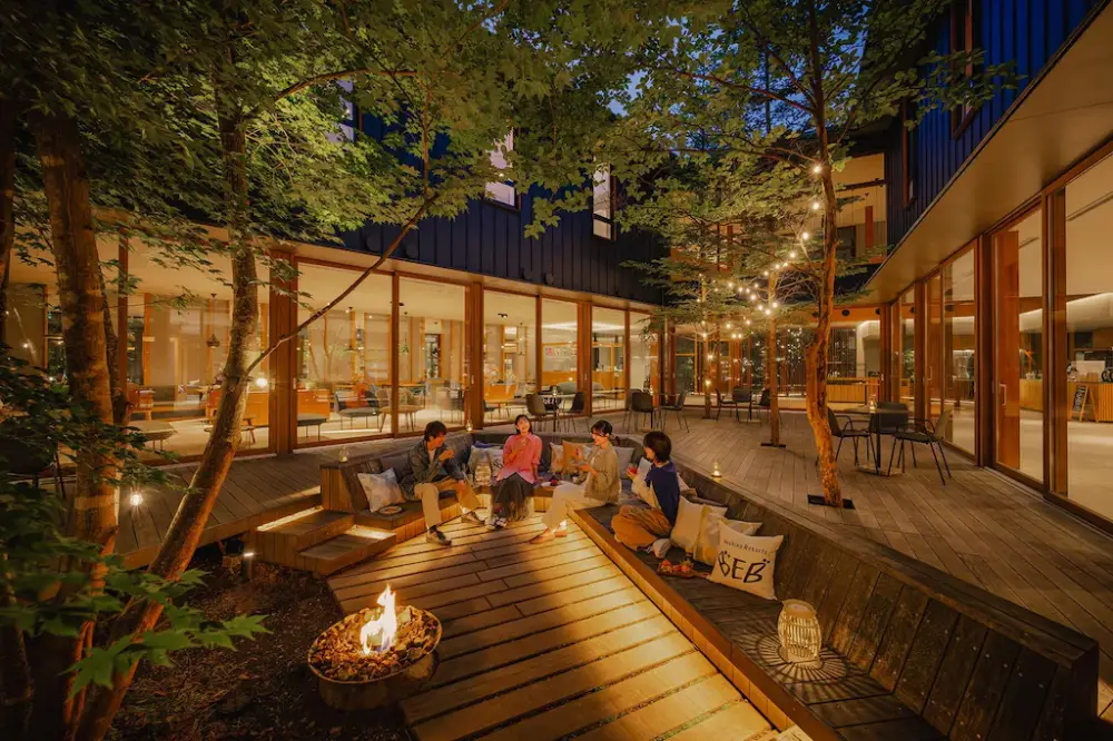 BEB5輕井澤 (BEB5 Karuizawa by Hoshino Resorts)這間是星野集團為了年輕人打造的「居酒屋以上,飯店未滿」的新型態住宿。BEB5 的氛圍非常鬆弛,主打「24 小時開放的公共空間(TAMARIBA)」,你可以隨時在那裡喝酒、吃零食、玩桌遊,甚至可以自帶外食。