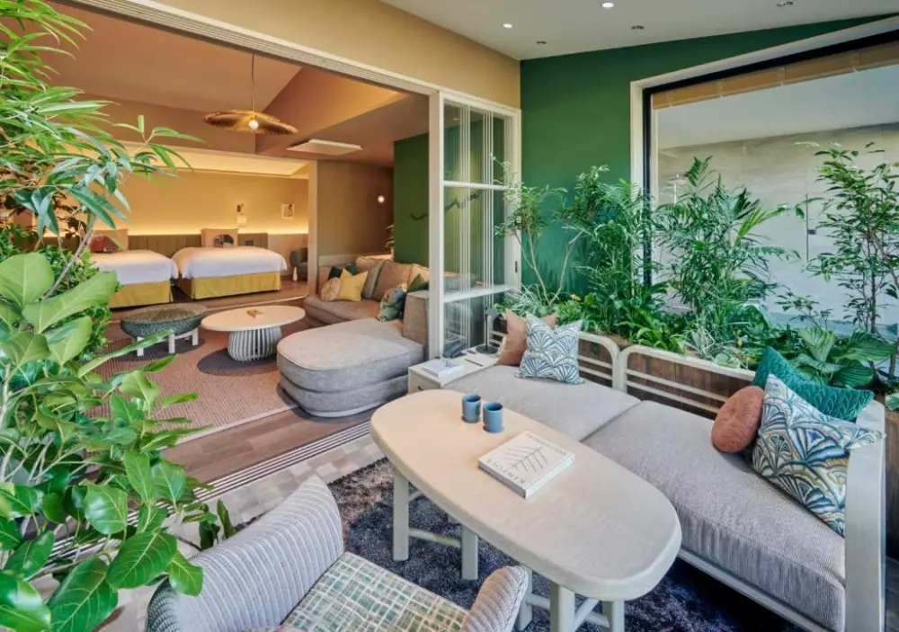 如果不喜歡「靜養之森」那麼深沉的色調,那「陽光之風」會是你的菜。這間同樣是 Fufu 系列,但風格截然不同,主打明亮、綠意和陽光。馥府 輕井澤 陽光之風 (Fufu Karuizawa Yokou No Kaze)大廳擺滿了綠色植物,房間色調以淺木色和白色為主,給人一種輕鬆活潑的度假感。