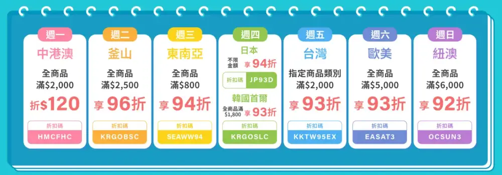 - 折扣碼:USHTW9,週日紐澳滿6000享93折