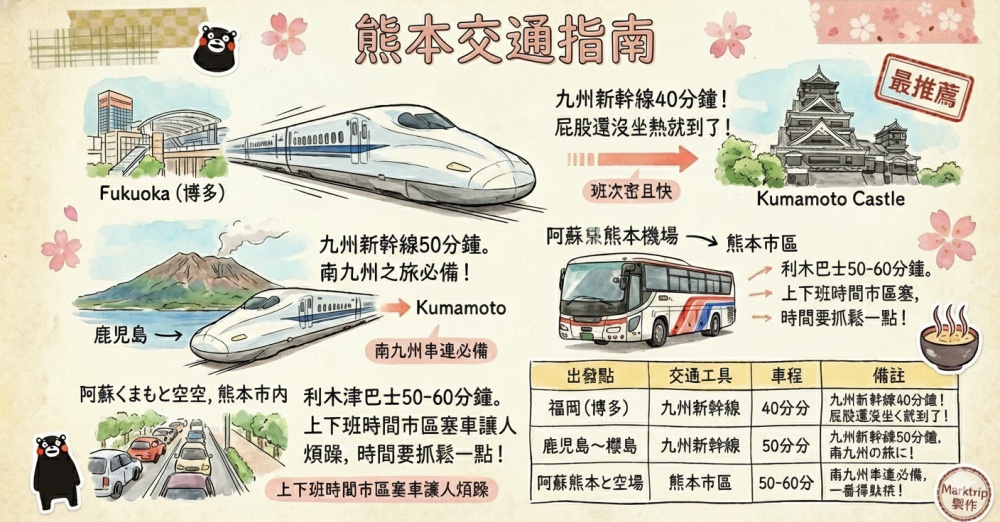 | 福岡 (博多) | 九州新幹線 | 40分鐘 | 最推薦,班次密且快 |