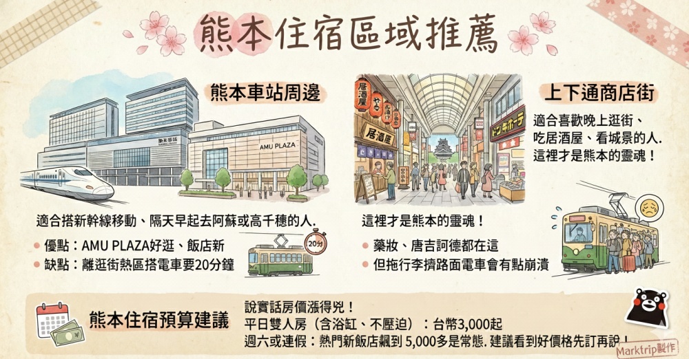 - 熊本車站周邊: 適合搭新幹線移動、隔天早起去阿蘇或高千穗的人。優點是 AMU PLAZA好逛、飯店新;缺點是離逛街熱區搭電車要20分鐘。