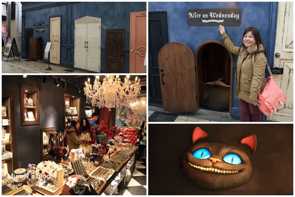 充滿話題性的水曜日のアリス,就在大須觀音往商店街的入口處,是被網友稱為來日本必逛的飾品店,裏頭從裝飾到商品都與愛麗絲夢遊仙境有關,就連入口處也佈置的很有特色,整排的大門,但真正門口卻是好小一個,還得彎腰才能進入。