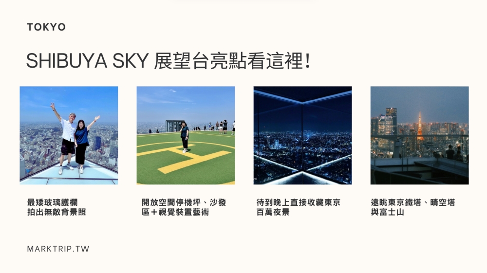 無論是第一次造訪東京,或是多次回訪的深度旅人,澀谷SHIBUYA SKY都是值得放入行程的東京觀景名所。從高空眺望城市繁華、享受商場購物樂趣,到與朋友家人共享難忘夜景,這裡將成為你旅途中最閃亮的回憶點。記得提早預約場次,拍好拍滿每一個角度,再順手把人氣伴手禮打包回家吧!